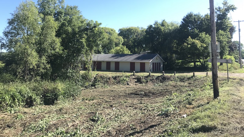 The trees and brush prevented customers from seeing this storage unit from the road, so we came in with a brush hog to remove the brush. We also cut and chipped the trees, leaving the stumps as a safety barrier for passing cars.